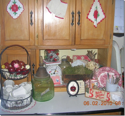 I made the framed apple and fork. I also made the moss balls that are in the dairylea box. It was $3.00 from an estate sale. In fact everything in the picture was from an estate sale or a garage sale and ranged in price from .25 cents ( the vintage cookbook) to $3.00 for the collection of cookie cutters. The scale was only $1.00. The transferware plate came in a set of 65 pieces for $20.00.... yes $20..... hate me!!!